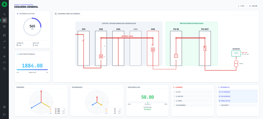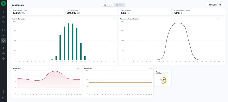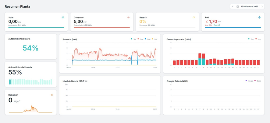 El sistema permite visualizar consumos, potencias, estados operativos, alarmas y variables ambientales desde cualquier dispositivo, integrando equipos como inversores, analizadores de redes, estaciones meteorológicas o sensores específicos. Además, incorpora indicadores avanzados como el análisis de pérdidas y la eficiencia real de la instalación.